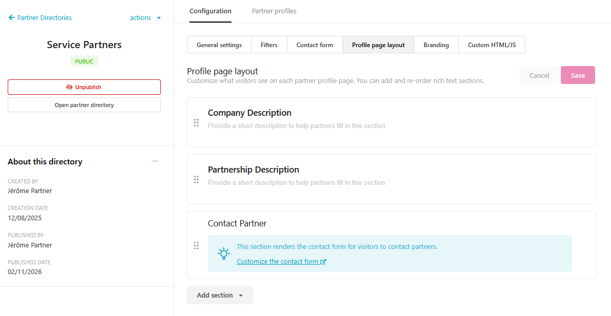 Each partner profile is built from configurable sections. Out of the box, every profile includes a Company Description, a Partnership Description, and a Contact form. You can add as many Rich text sections as you like — ideal for showcasing certifications, service areas, industry specializations, or anything else that helps a visitor understand what that partner brings to the table.